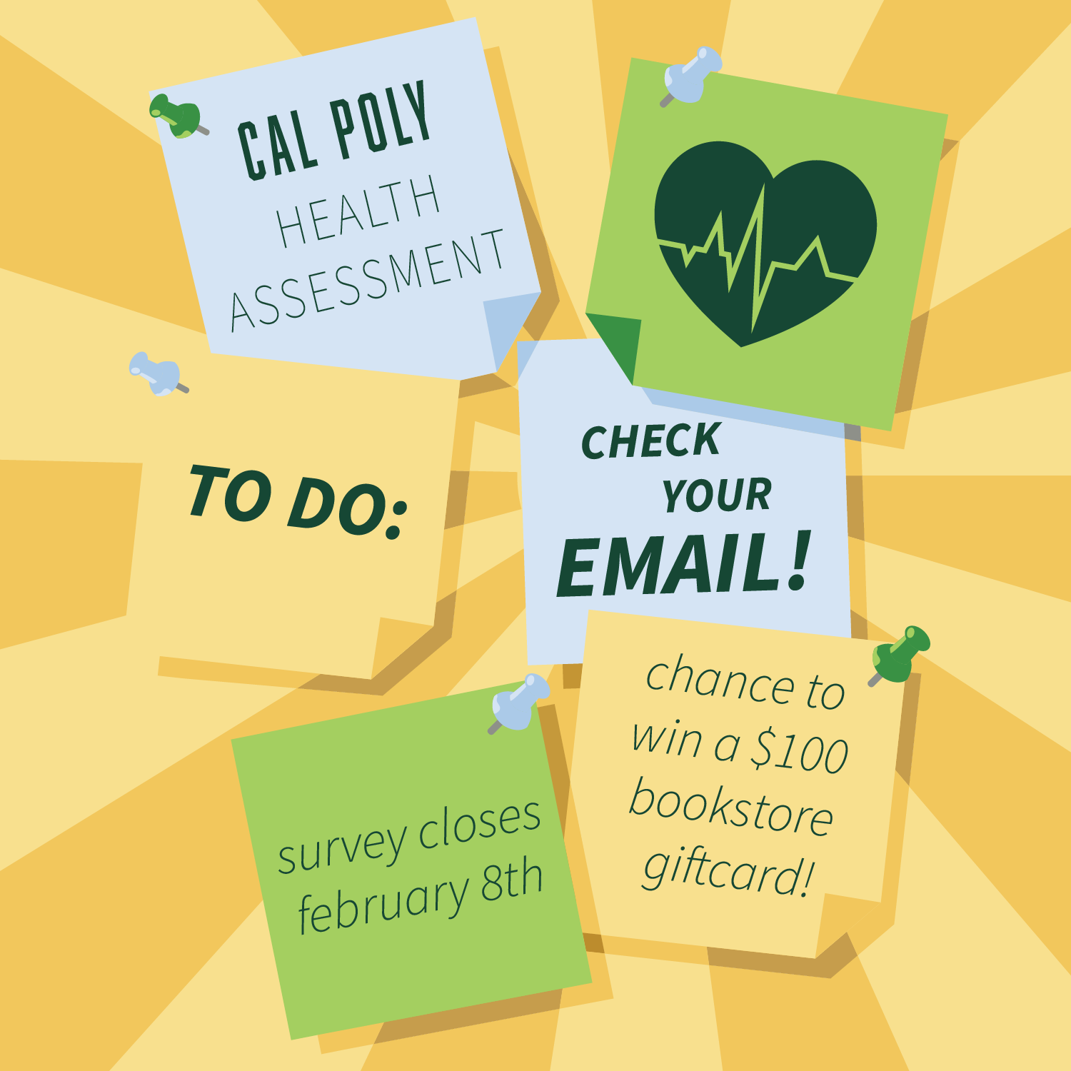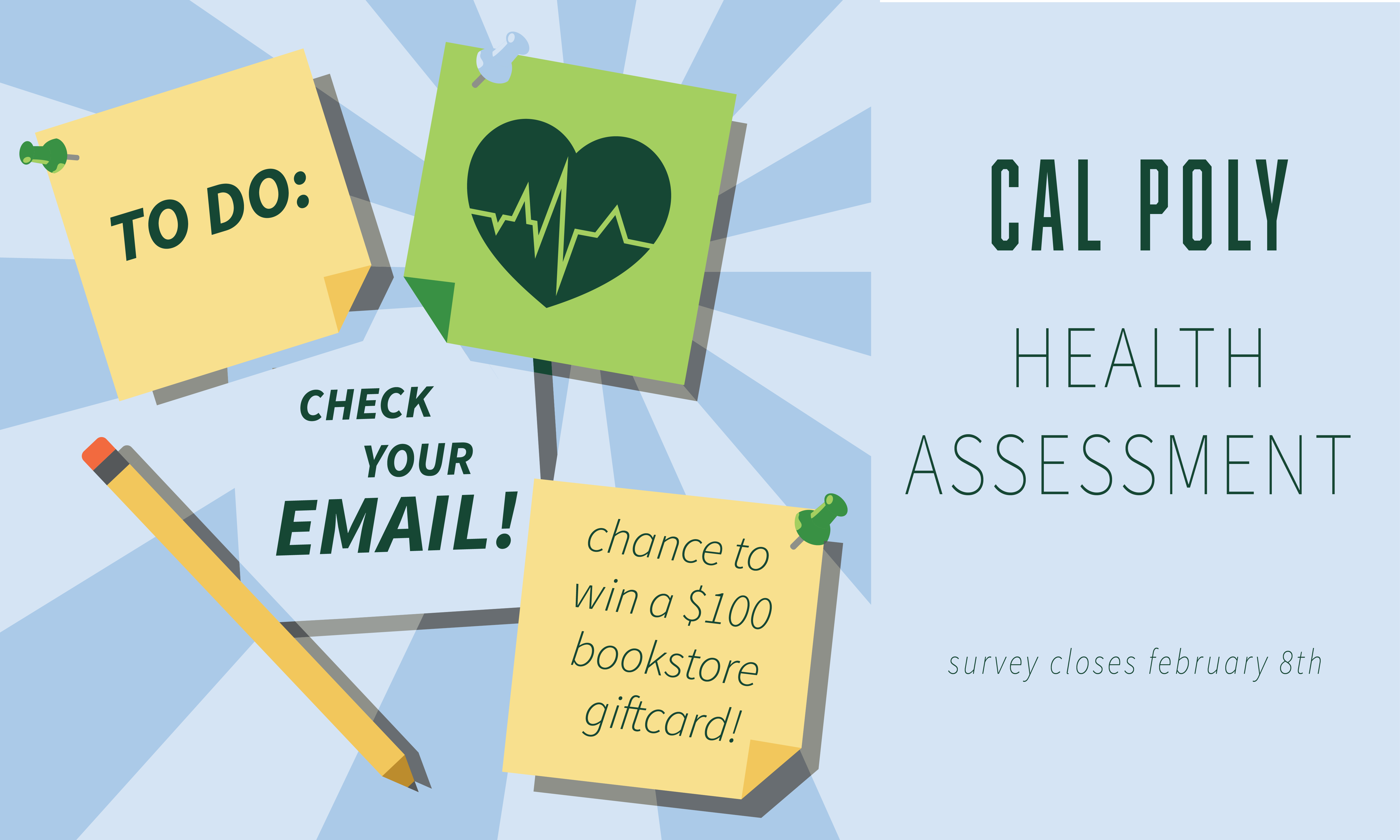 Make an impact with the stroke of a key – take Cal Poly’s Health Assessment today! Campus Health & Wellbeing needs your input to make our university an even better place! By participating in this voluntary and confidential biannual survey, you can help shape health and wellness programming for you and future Mustangs! Don’t wait – check your email and take 20 minutes to complete the survey today for the chance to win one of 25 $100 Cal Poly Bookstore gift cards!